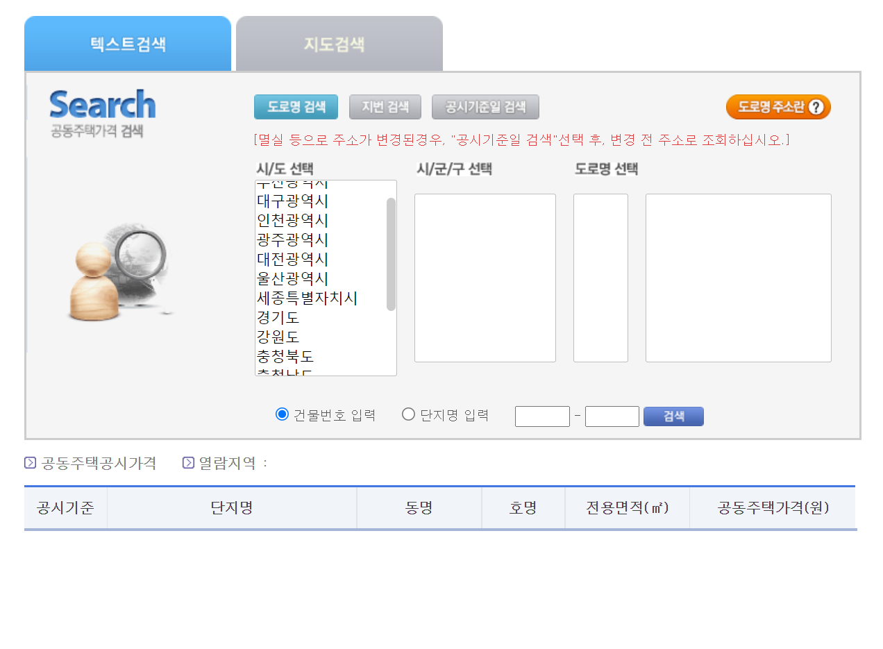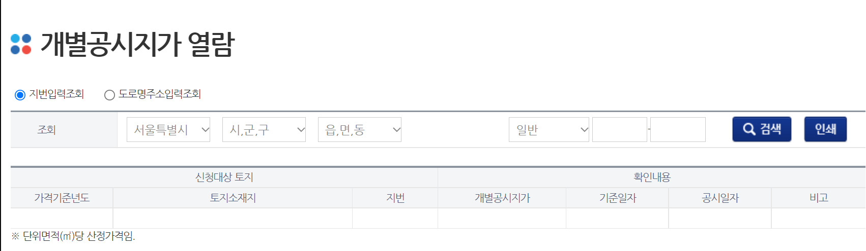 4. 주소를 기입 후 검색을 하면 공시지가, 일자 등이 표시됩니다.