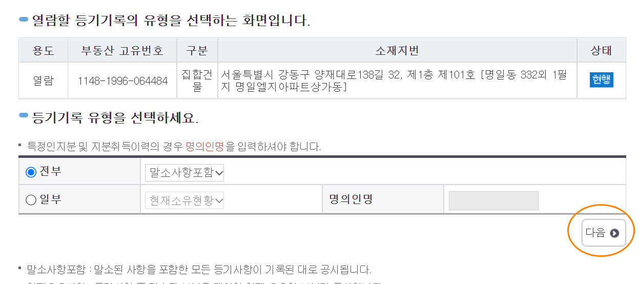 5. 등기기록 전부/일부 중 선택한 후 다음을 눌러 진행해주세요.
