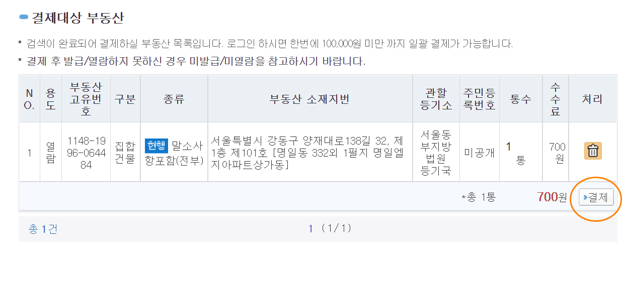 부동산 등기부등본 열람 시 수수료는 700원, 발급 시 1000원이 발생하는 점 참고해주시기 바랍니다.