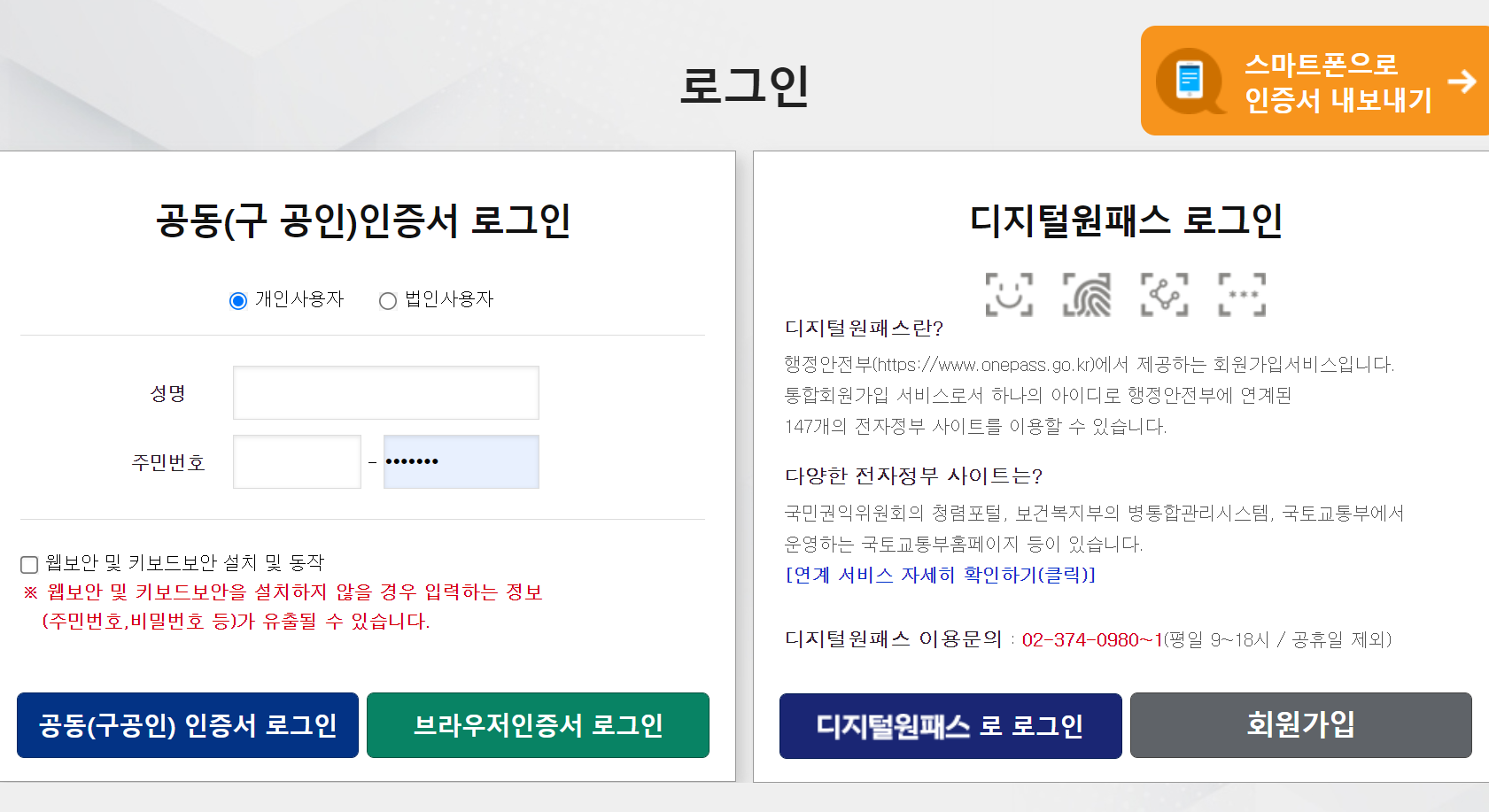3. 공동인증서(구 공인인증서), 디지털원패스 등을 통해 로그인을 해주세요.