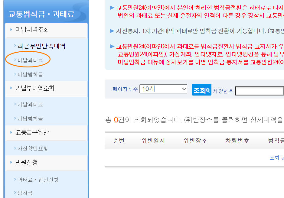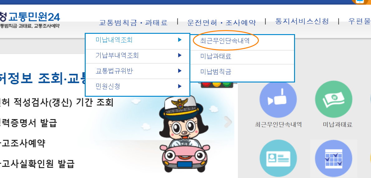 2. 상단 메뉴에서 미납내역조회 ▶ 최근무인단속내역으로 들어갑니다.