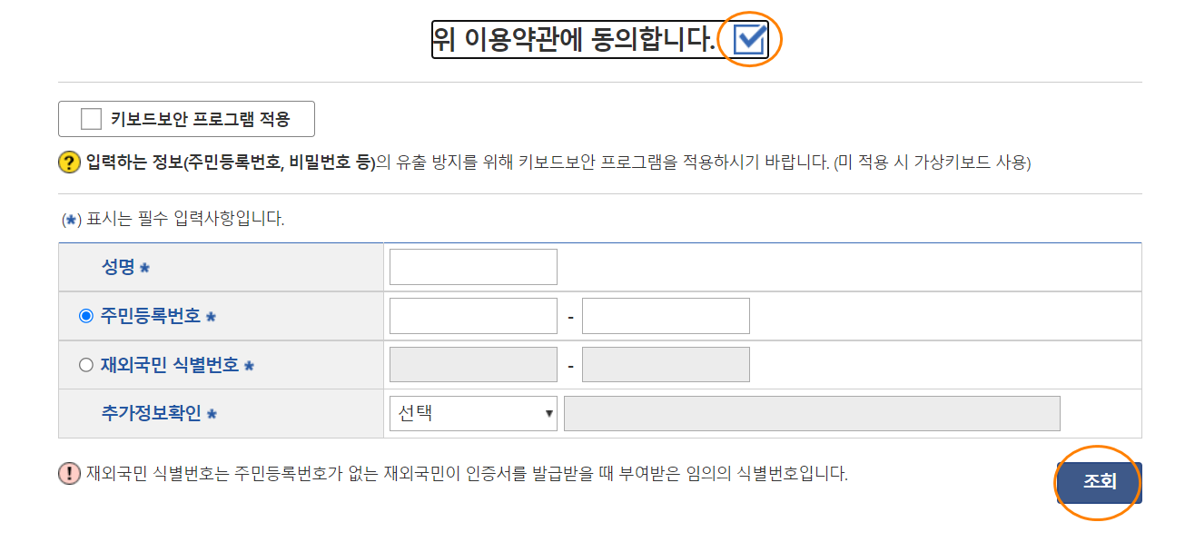 4. 아래 약관 동의 체크 후 본인확인 내용 입력 후 조회버튼을 눌러주세요.