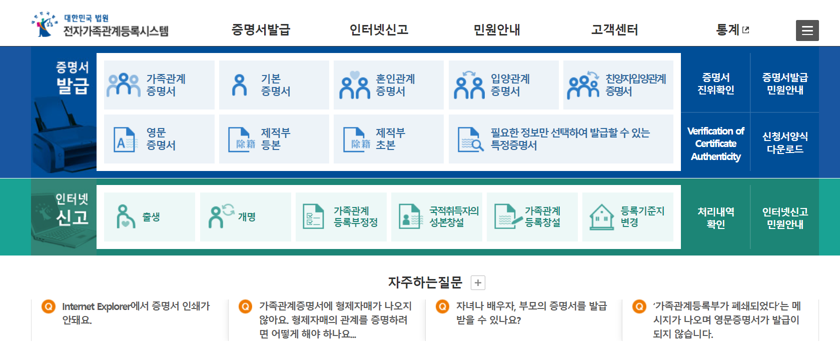 전자가족관계등록시스템 홈페이지
