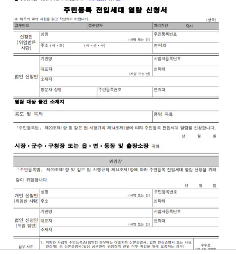 아쉽게도 전입세대열람원 인터넷발급은 불가합니다. 대신 주민센터에 방문해 아래 내용을 참고해 꼼꼼히 신청서를 작성해주세요.
