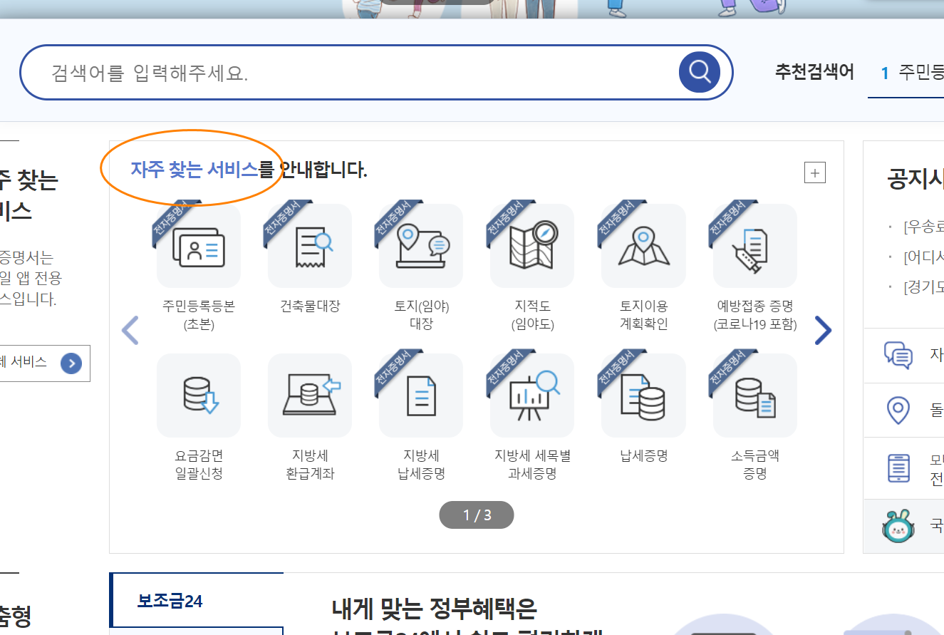 정부에서 운영하는 주요 서비스를 한 곳에서 모두 처리할 수 있도록 만들어진 사이트가 있습니다. 바로 정부24인데요. 각 기관의 주요 서비스, 정책정보, 기관 안내, 상담 등을 제공하고 있습니다. 본인확인만 되면 누구나 행정기관 방문 없이도 민원업무를 간편하게 처리할 수 있습니다.